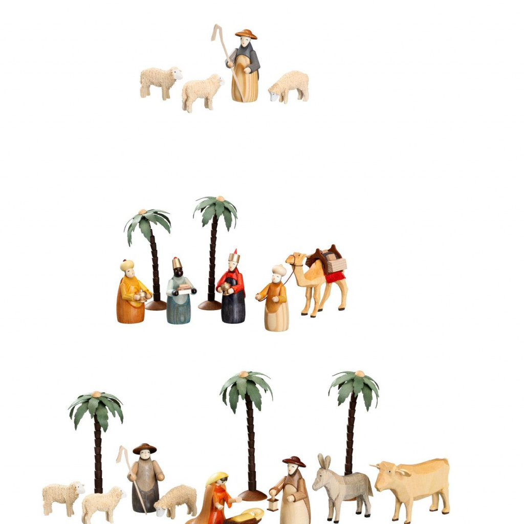 Krippenfiguren Bestückung Pyramide 3 Stockwerke, Figuren naturfarbig Ausführung wie Artikel 225/238 B nur naturfarbig Stockwerk: Heilige Familie, Hirte mit 3 Schafen, Ochs (stehend) Esel, 3 Palmen 2. Stockwerk: 3 Könige,…