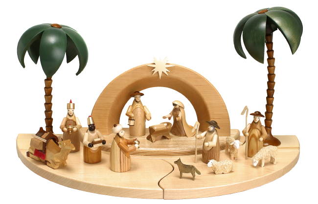 Weihnachtskrippe mit Bodenplatte aus verschiedenen Segmenten, Palmen aus Massivholz, Figuren ca. 9 cm, naturfarbig aus verschiedenen einheimischen Hölzern Fertigung auf Anfrage, längere Lieferzeiten beachten Breite 48 cm Tiefe 23 cm…