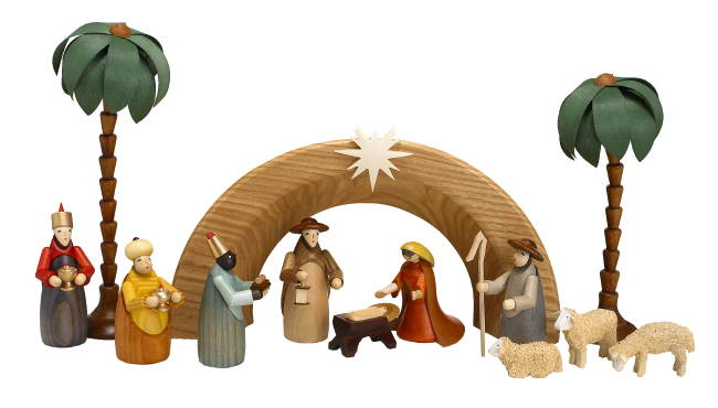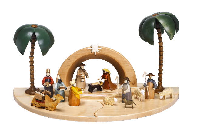 Weihnachtskrippe mit Bodenplatte aus verschiedenen Segmenten, Palmen aus Massivholz, Figuren ca. 9 cm, farbig lasiert Fertigung auf Anfrage, längere Lieferzeiten beachten Breite 48 cm Tiefe 23 cm Höhe 22 cm