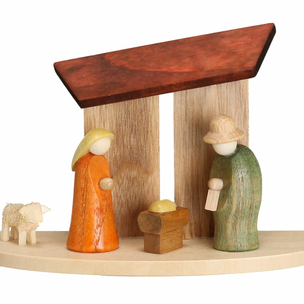 Krippenminiatur mit Teelicht Höhe 6 cm, Breite 20 cm, Tiefe 10 cm, Figuren 2,5 cm Heilige Familie, Hirte mit 2 Schafen, Könige, Palmen