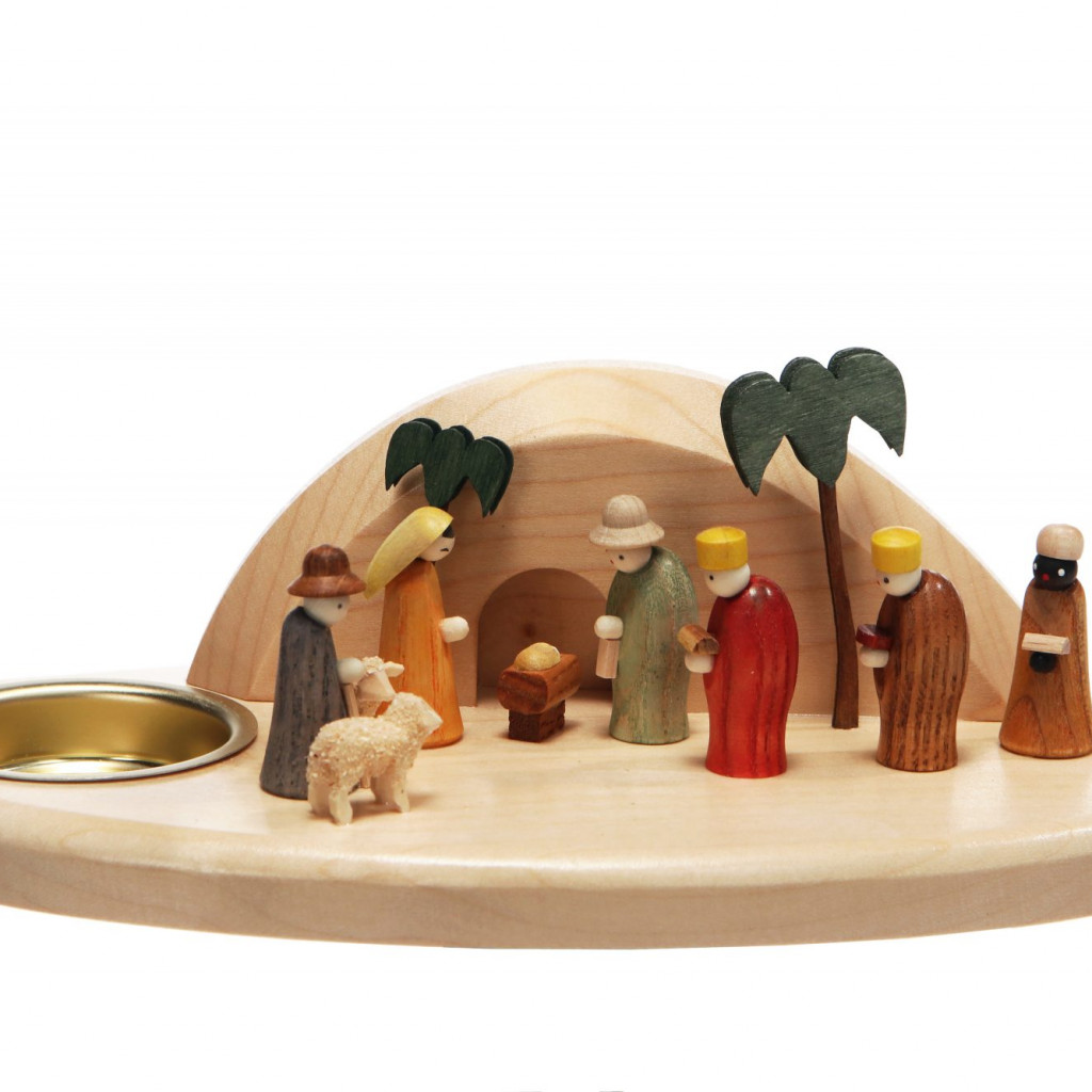 Miniaturbogen, Krippe, 2 Kerzen Bogen natur, Miniaturfiguren farbig lasiert Breite 22 cm Höhe 7,5 cm