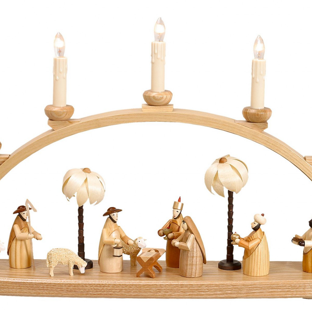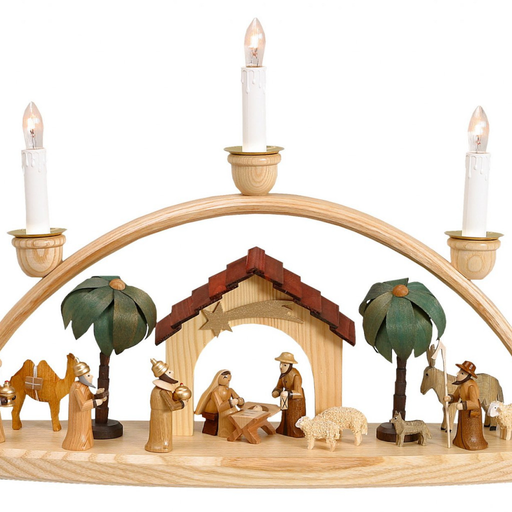 Lichterbogen mit Krippe Bogen durch LED innen beleuchtet Figuren 9 cm, farbig lasiert Bogen elektrisch mit Trafo Breite 60 cm Höhe 25 cm Tiefe 11 cm